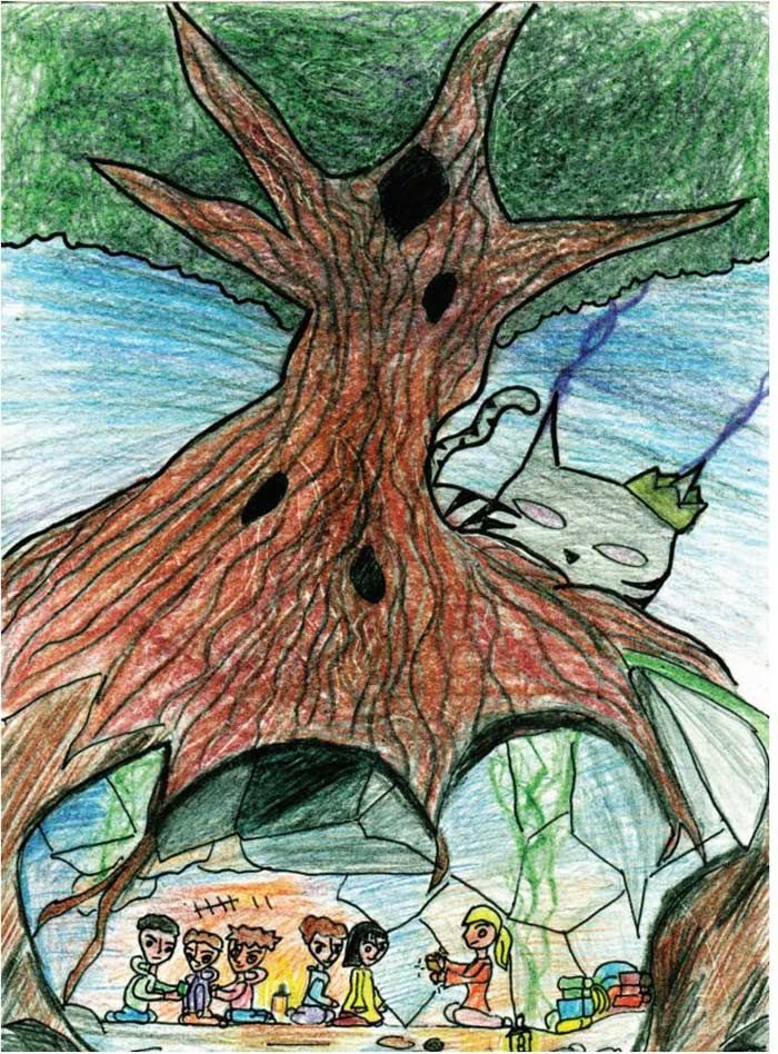 Frightened by the night, the group huddled together beneath the trunk of a large tree for safety. As they sat there, the ground suddenly trembled. They heard rumbling sounds from a distance, and soon realized that it was the beast. Simone, one of Evan’s friends, recalled reading an old book that described the creature: “It’s blind,” he whispered, “it can only detect movement, sound, and vibrations.”