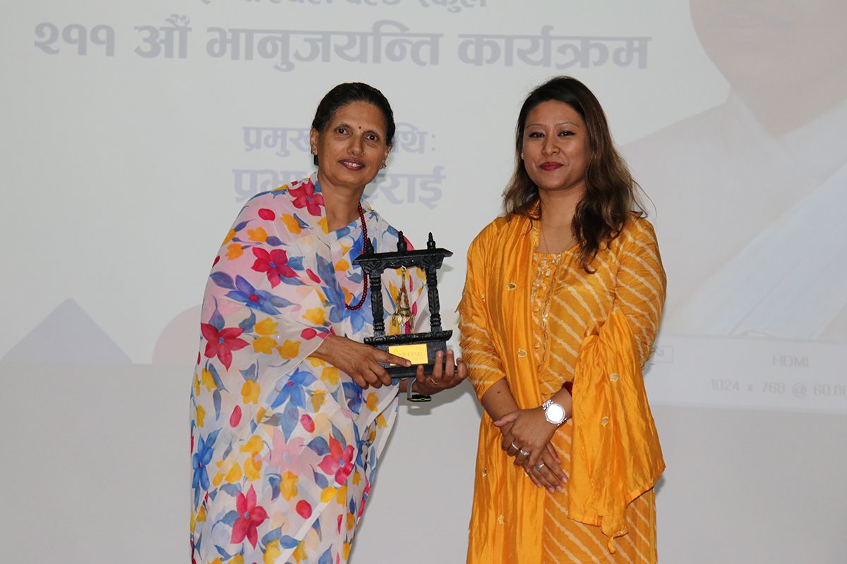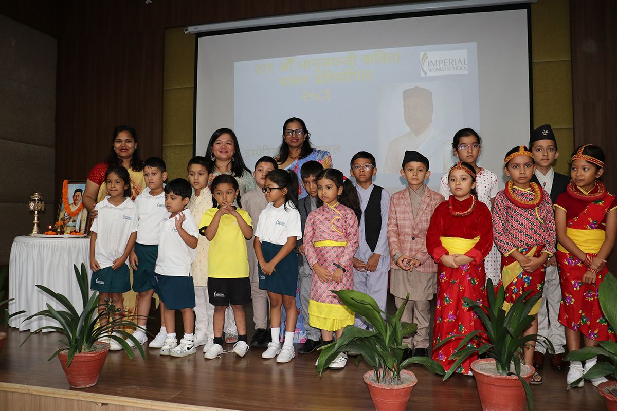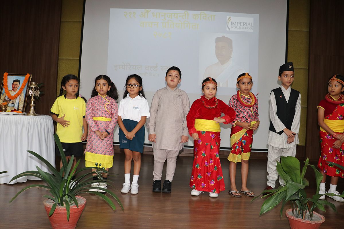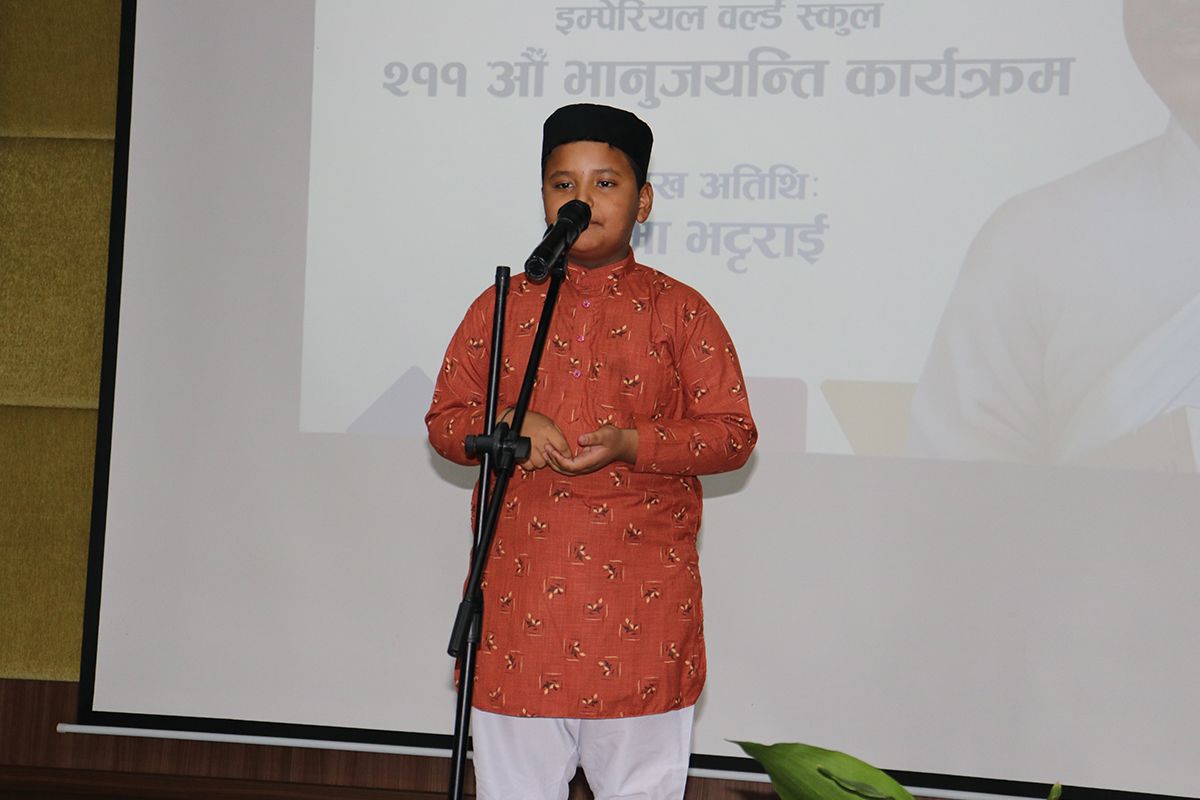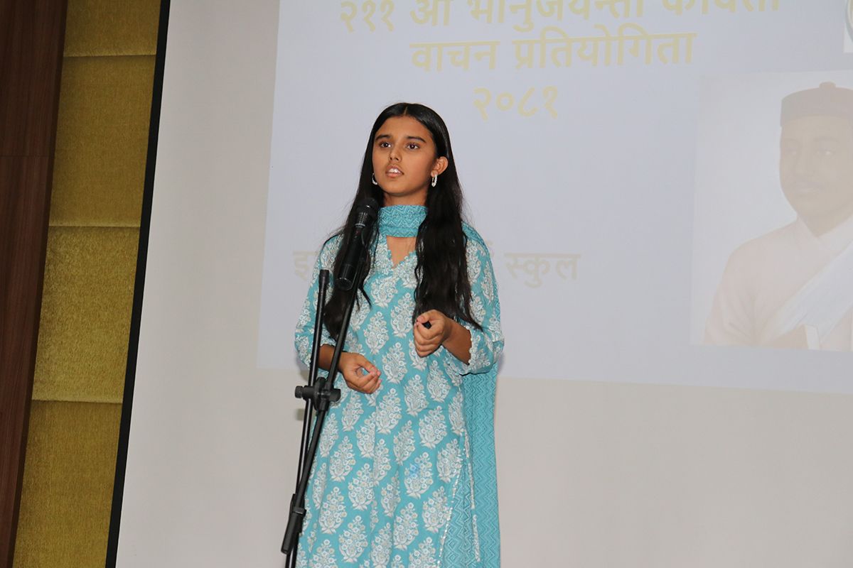 २११औँ भानुजयन्तीका अवसरमा वरिष्ठ कवि प्रभा भट्टराईको प्रमुख आतिथ्यमा साहित्यका आदिकवि भानुभक्तको स्मरण गर्दै नेपाली भाषाप्रति सद्भाव र प्रेम जगाउने उद्देश्यले आज कवितावाचन कार्यक्रम सम्पन्न गरियो। कक्षा १ देखि कक्षा १० सम्मका विद्यार्थीहरूले विभिन्न चरणमा वरिष्ठ कविहरूद्वारा रचना गरिएका विभिन्न छन्दका कविताहरू वाचन गरे। विजेता कविता वाचकहरूलाई प्रमुख अतिथिको हातबाट प्रमाणपत्र वितरण गरिएको थियो।