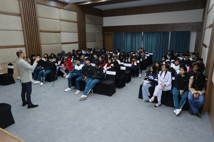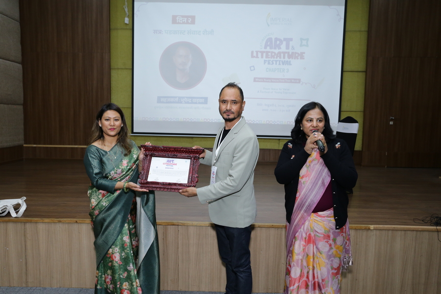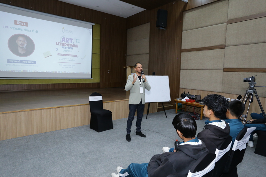 KALF Chapter 3 अन्तर्गत नेपाली विभागद्वारा आयोजित “पडकास्ट–संवाद शैली” सत्रमा भुपेन्द्र खड्काज्यूले पडकास्टका माध्यमबाट संवाद कसरी प्रभावकारी, सशक्त र आकर्षक बनाउने भन्ने विषयमा व्यवहारिक ज्ञान साझा गर्नुभयो। यस सत्रले विद्यार्थीहरूलाई आधुनिक सञ्चार माध्यम, प्रस्तुतीकरण कला र अभिव्यक्ति कौशल विकास गर्न प्रेरित गर्यो।