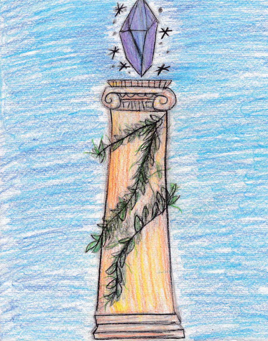 After a few weeks of travelling, she came across a blinding light. She assumed that that was it! She walked towards the light. Suddenly, she got caught in a harsh breeze and it was getting foggy, so it was very hard for her to see anything. But she didn’t stop walking. After a while, she bumped into something and stopped. Suddenly the fog disappeared and she found a pillar and on top was a beautiful amethyst. She went forward and picked up the jewel. Instantly, the pillar began to break and the ground started shaking. Erica ran and ran, and soon she stopped. The ground stopped shaking and in front of her, she saw a spring. She quickly sprinted towards it and washed her face and drank some water.