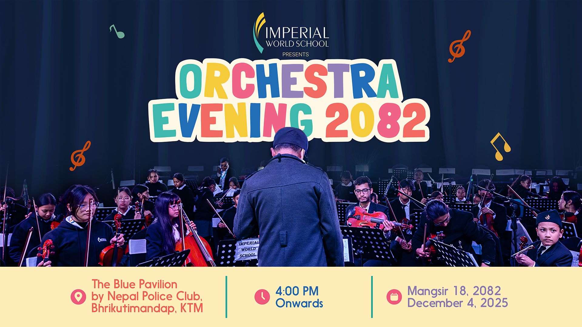Imperial World School is delighted to host Orchestra Evening 2082 for the second consecutive year—a grand celebration of music, learning, and artistic expression. This year’s event will take place on December 4, 2025, at The Blue Pavilion, Nepal Police Club, Bhrikutimandap, Kathmandu.